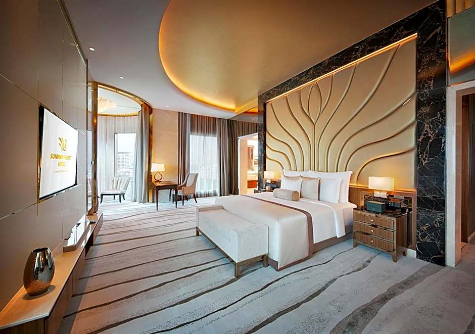 This presidential suite comes with city view and features floor-to-ceiling windows. It has a walk-in closet, en-suite marble bathroom with freestanding bathtub and a rain shower with views of Sunway Lagoon. A spacious living, bar and dining areas are also available.
